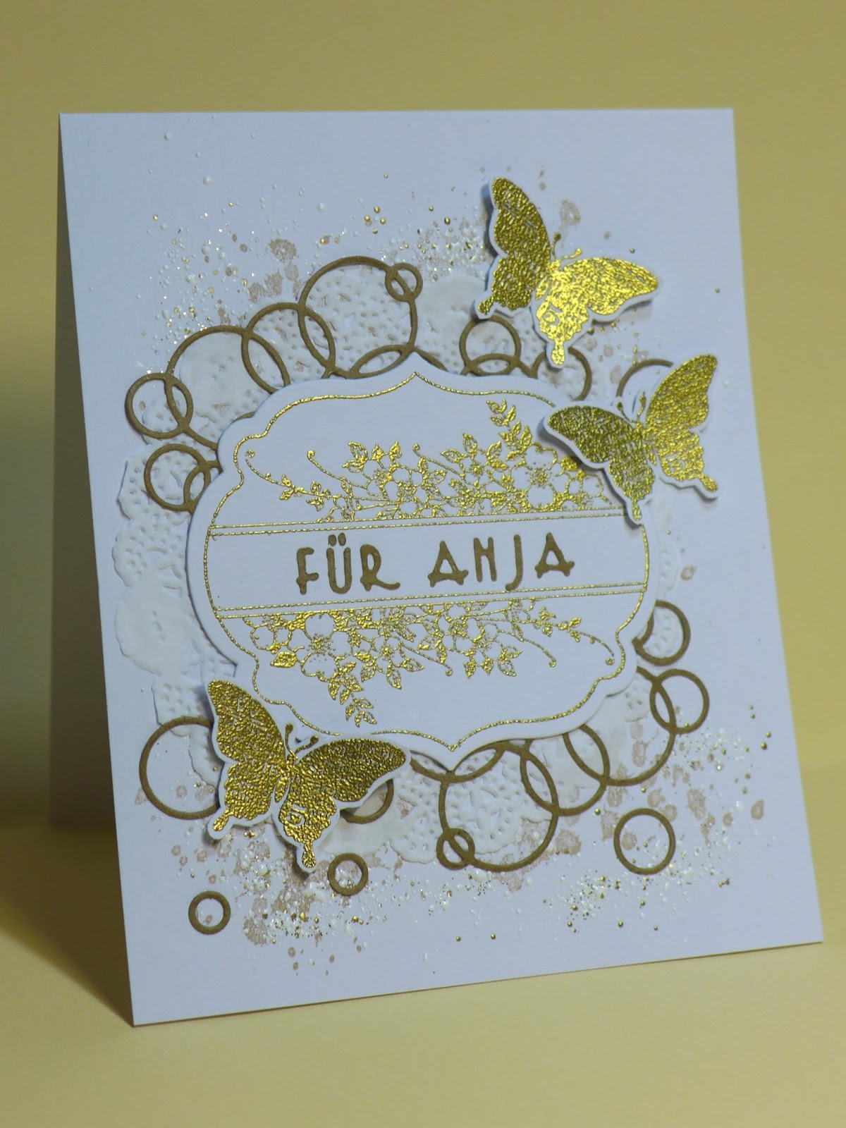 This card I sended to my niece. I stamped splatters in the background and heat-embossed the Frantage embossing powder. The next layers are a doily and die-cut circles. The main image ist stamped and embossed. The letters are die-cut too. It's a unobtrusive look, but it was a lot of work. So I hope you like it.